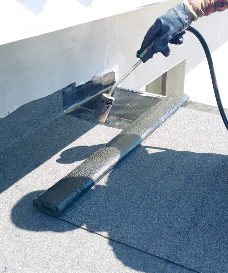 工法としては、改質アスファルトシートをトーチで焼き付けて貼っていくトーチ工法が主流となっております。